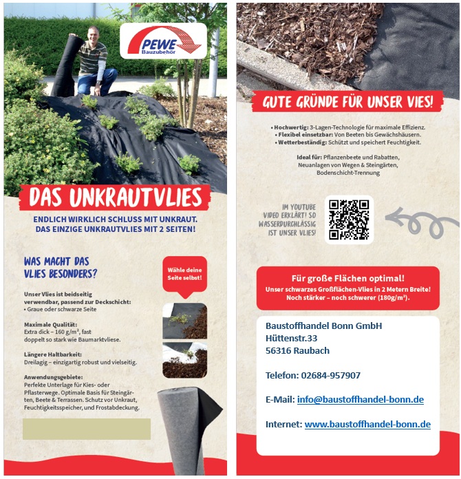 (auch außerhalb des Hausbaus) machen unser Drainage- und Unkraut-vlies zu einem geschätzten Produkt.